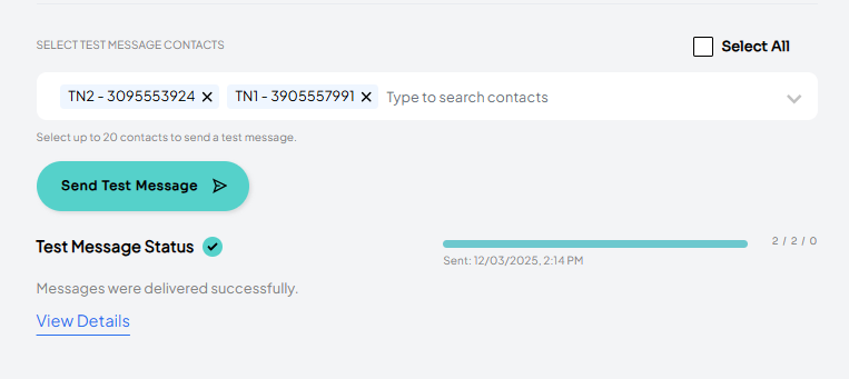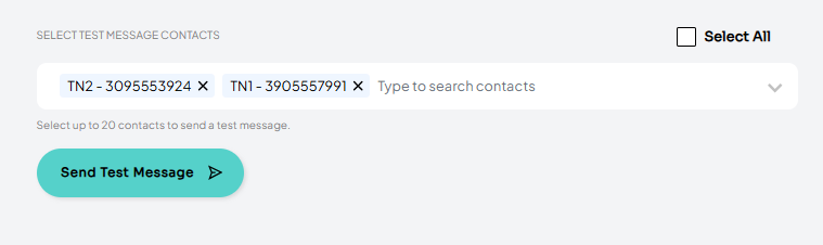 Before running the A/B test, you can send out preview or internal test messages to any test contacts available for the client. Simply select from the available numbers and click the ‘Send Test Message’ button. Please note: the test message will be sent out for whichever message version you are currently on (A or B).
