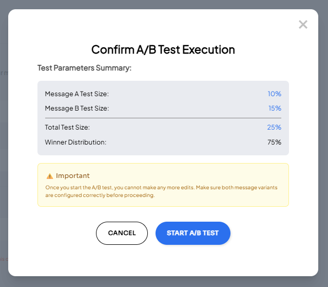 Review the percentage breakdown and confirm that you are ready to run the a/b test. Please note: once the A/B test begins, you will no longer be able to make any edits to the campaign.
