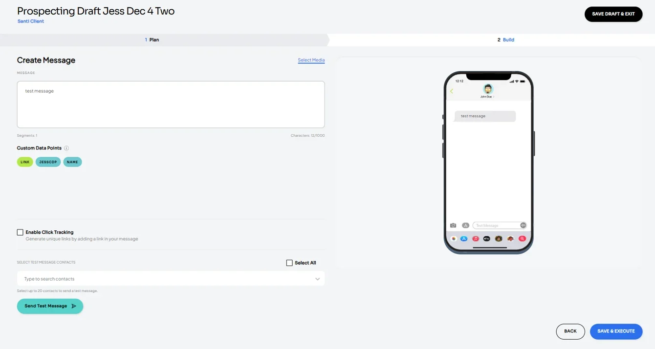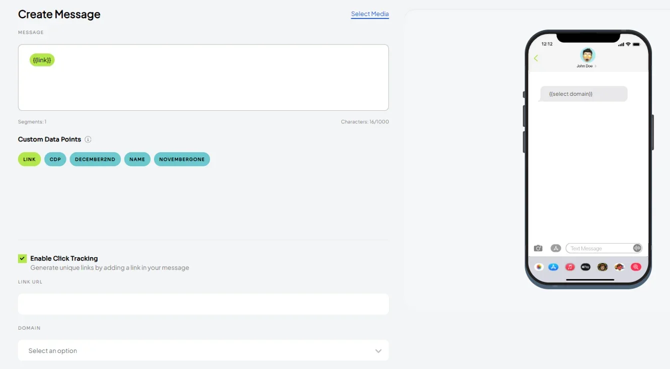 To include links in your message, select the ‘link’ custom data point and check the ‘Enable click tracking’ checkbox. Follow the remainder of steps and review the phone preview to ensure the correct short link was selected.