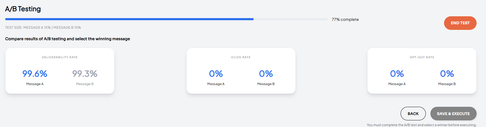 If you want to end a/b test earlier, you can click the ‘End test’ button. This will stop any remaining messages from being sent out.