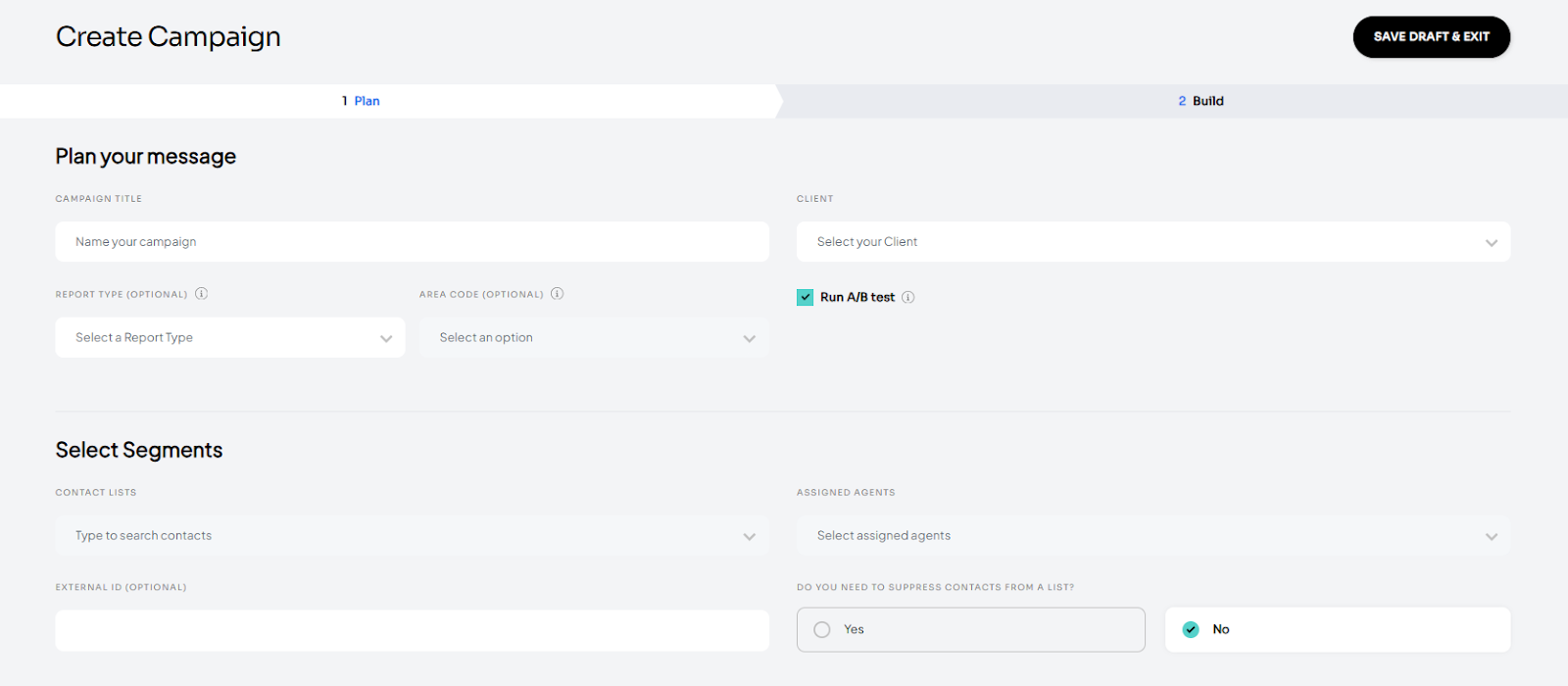 On the build page, fill out the two variations of the campaign message you want to send out.